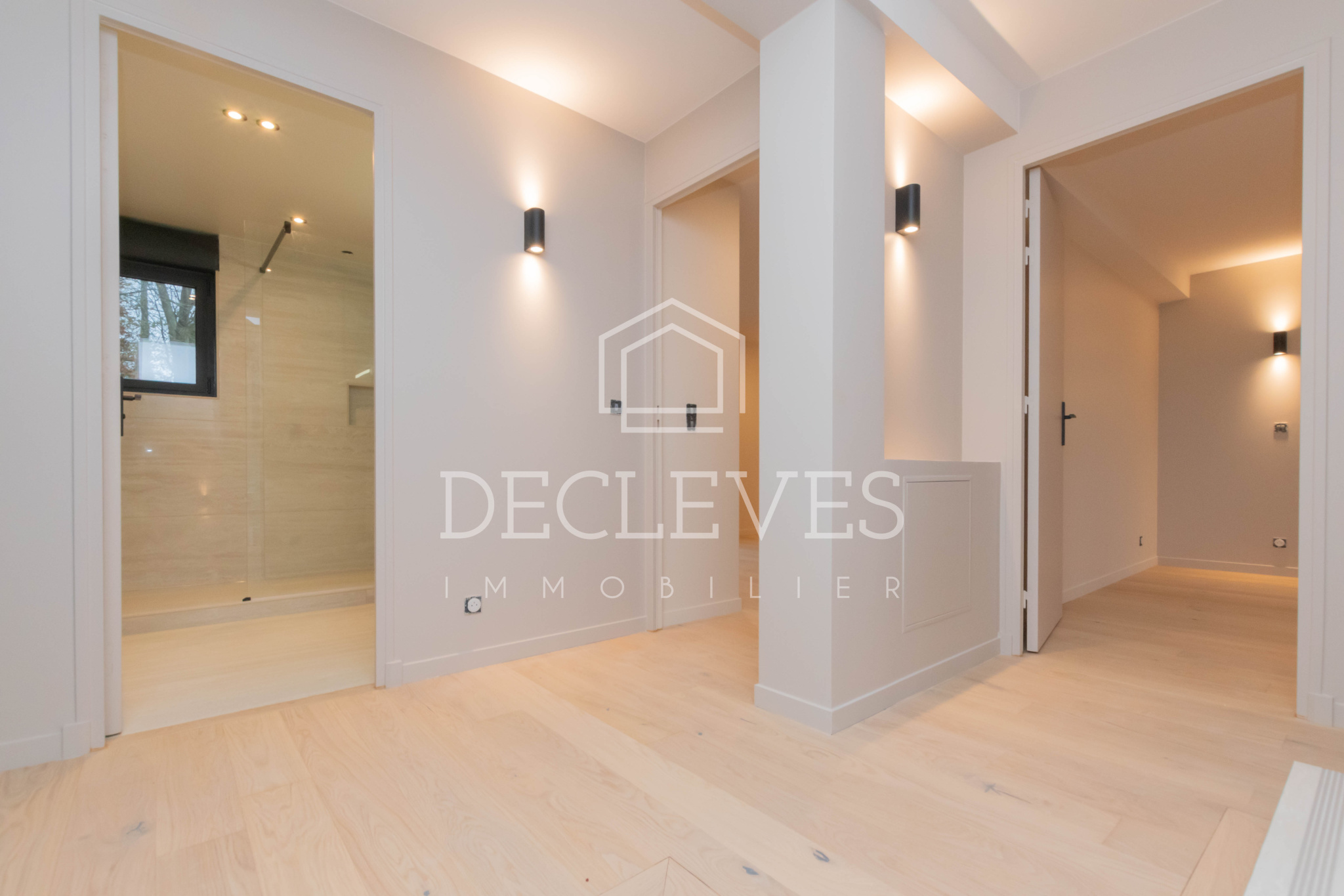 A l’étage : un palier dessert trois chambres (15,11 m2, 16,55 m2, 11 m2), dont une avec terrasse, une salle de douche et des toilettes.