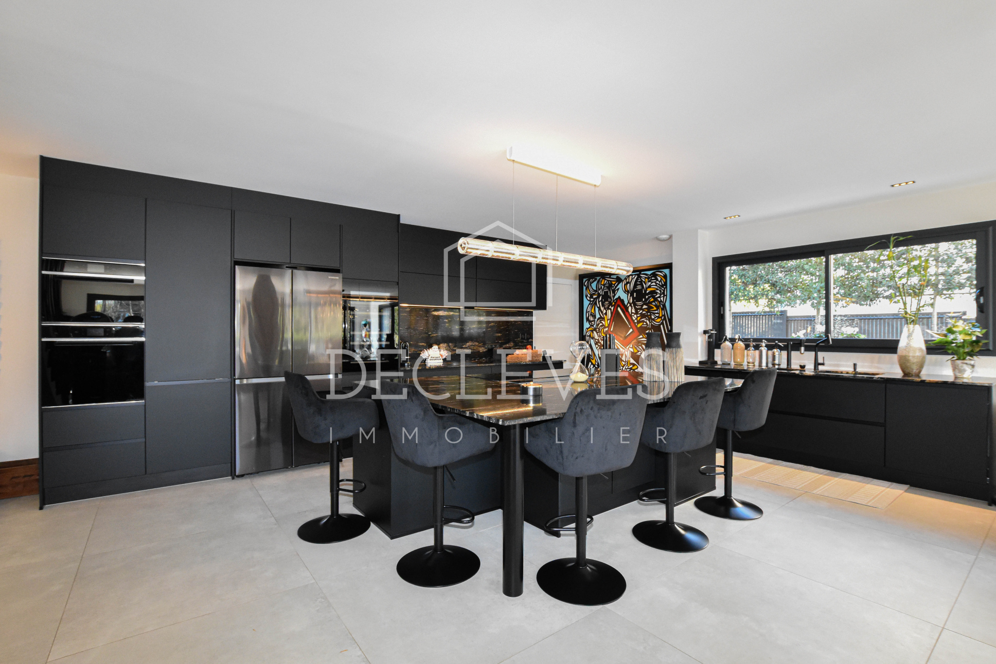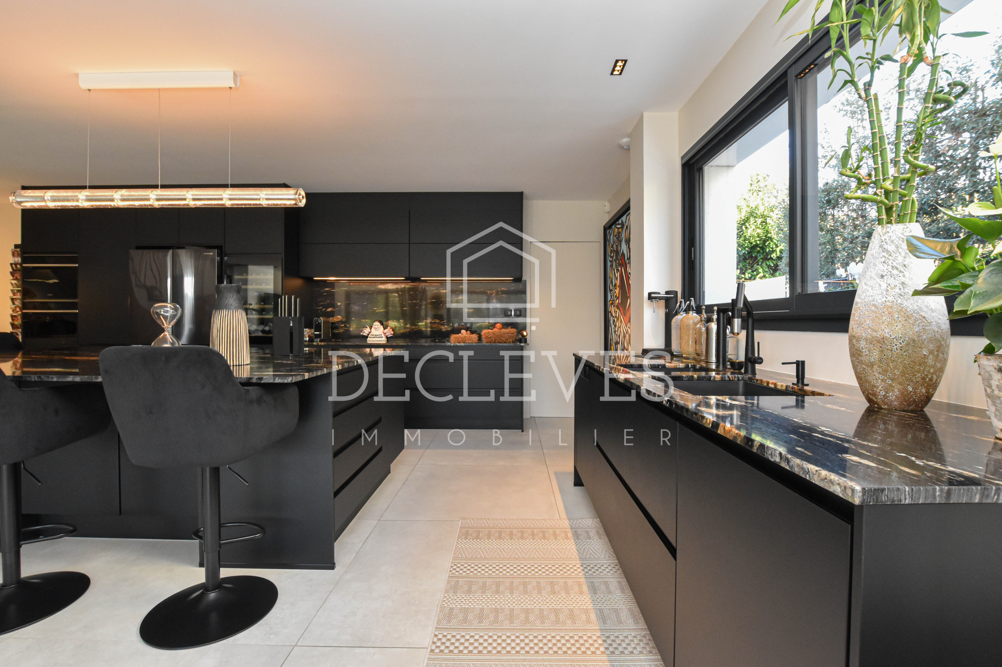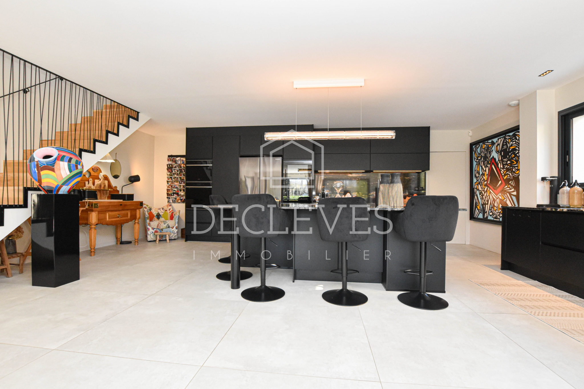 Le rez-de-chaussée dévoile une spectaculaire pièce de vie de plus de 90 m2, véritable cœur de la maison. L’espace salon s’ouvre harmonieusement sur une terrasse et un jardin paysager sans vis-à-vis, tandis que la cuisine dînatoire, conçue sur mesure, séduit par son îlot central et son électroménager haut de gamme. Une arrière-cuisine-buanderie complète cet espace avec fonctionnalité.
