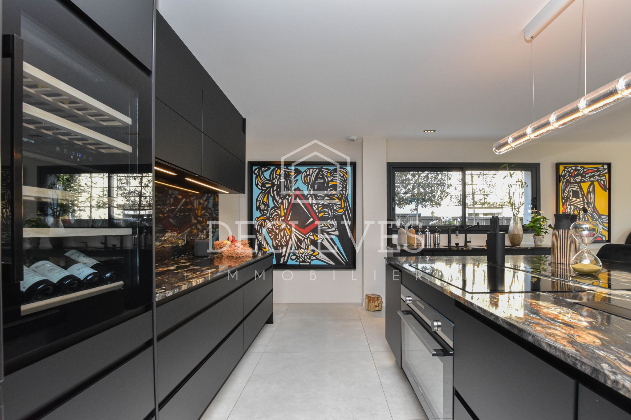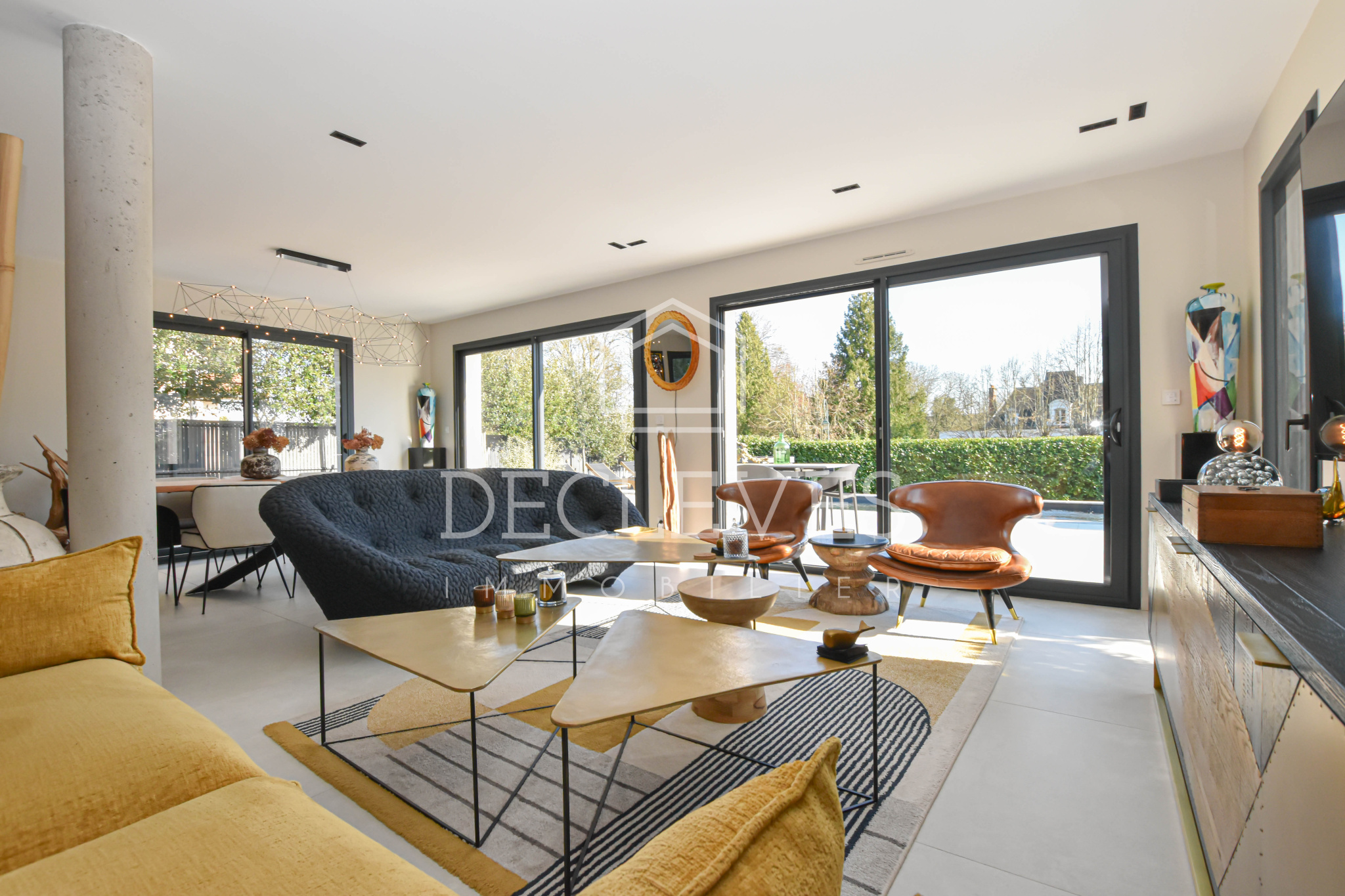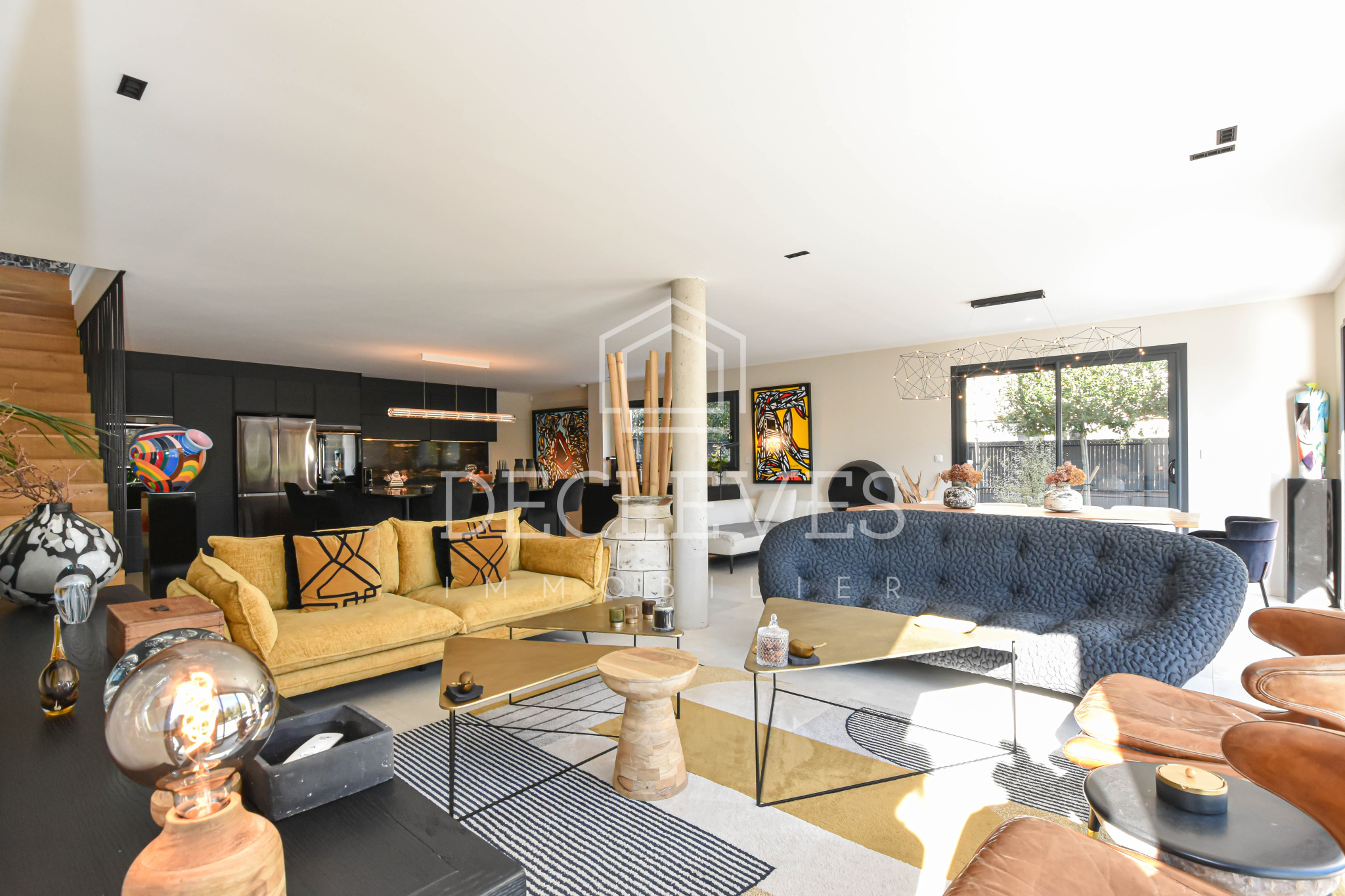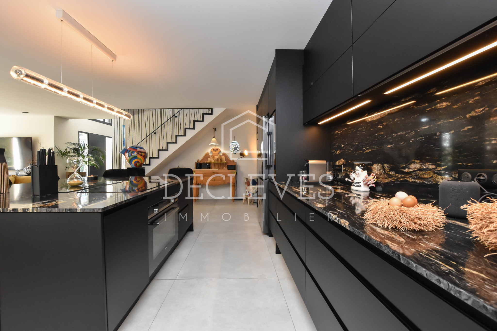 Le rez-de-chaussée dévoile une spectaculaire pièce de vie de plus de 90 m2, véritable cœur de la maison. L’espace salon s’ouvre harmonieusement sur une terrasse et un jardin paysager sans vis-à-vis, tandis que la cuisine dînatoire, conçue sur mesure, séduit par son îlot central et son électroménager haut de gamme. Une arrière-cuisine-buanderie complète cet espace avec fonctionnalité.