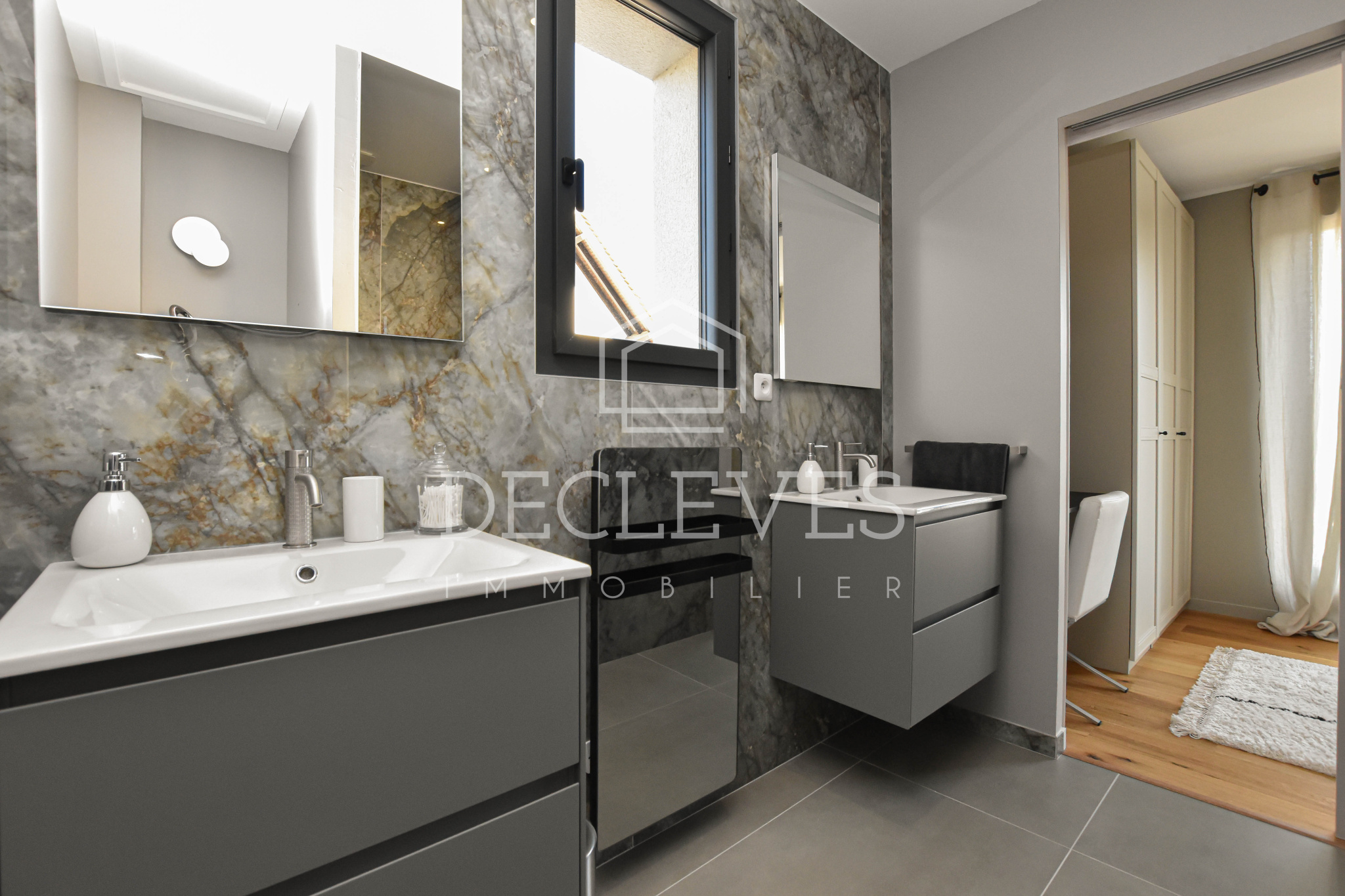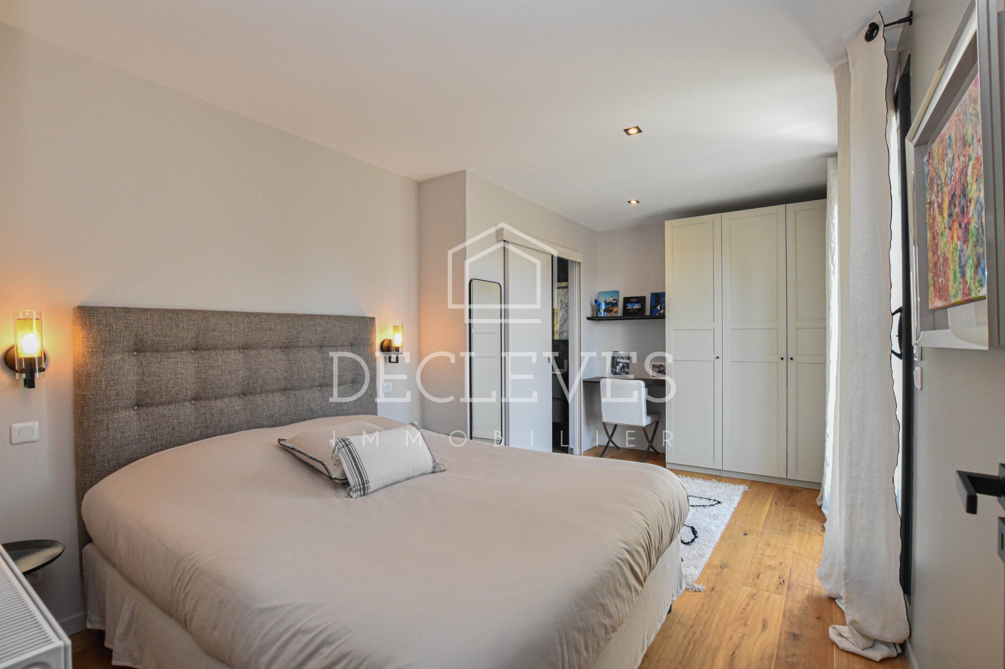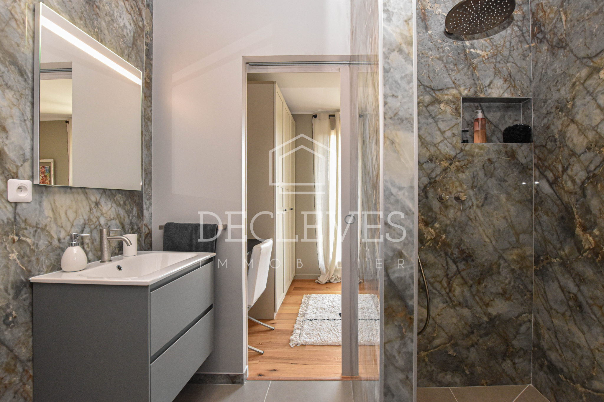 La suite parentale, élégante et intimiste, propose une chambre avec rangements intégrés, un dressing sur mesure et une salle de bains contemporaine dotée d’une douche à l’italienne. Des toilettes indépendantes viennent parfaire l’ensemble.