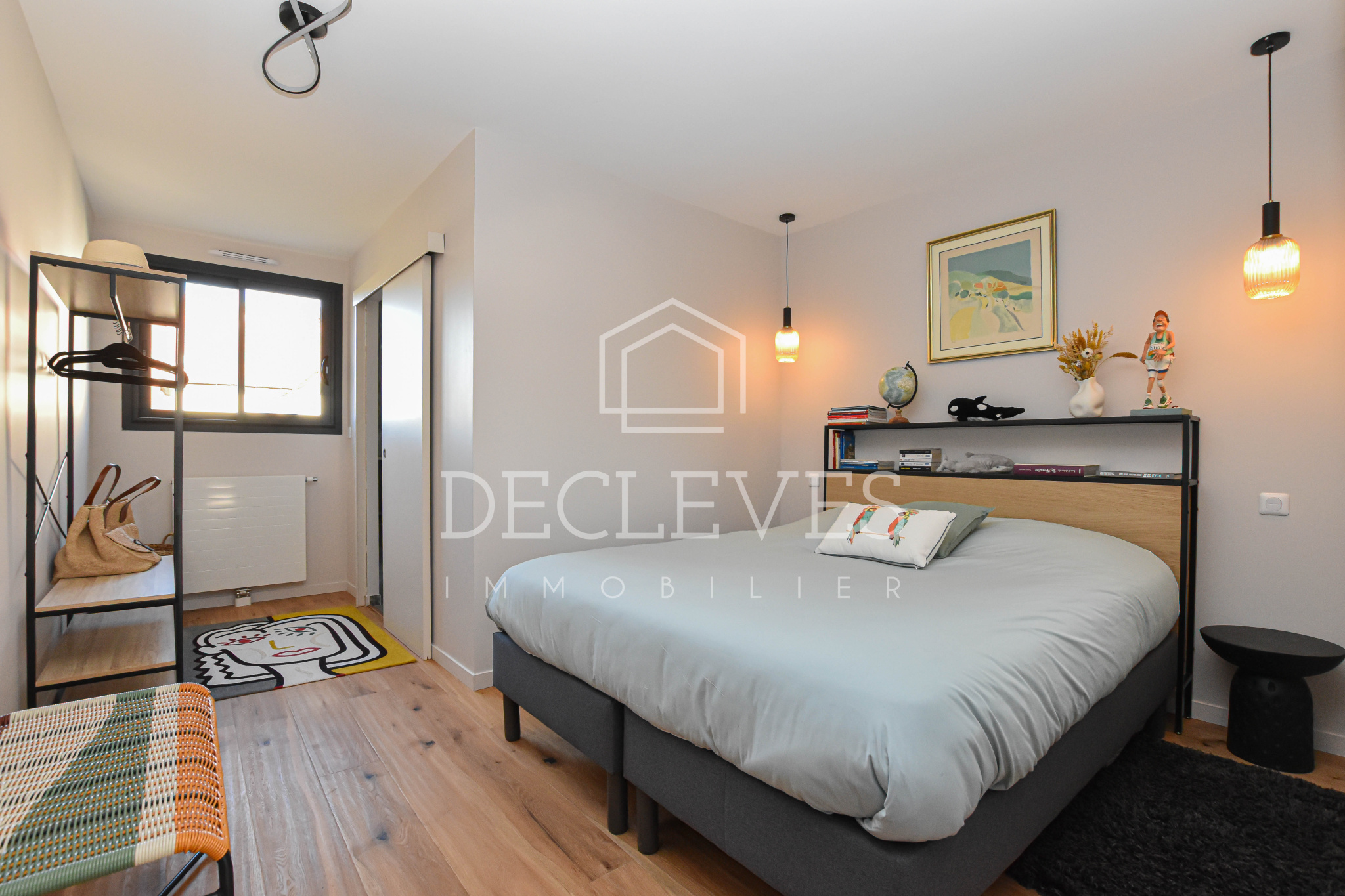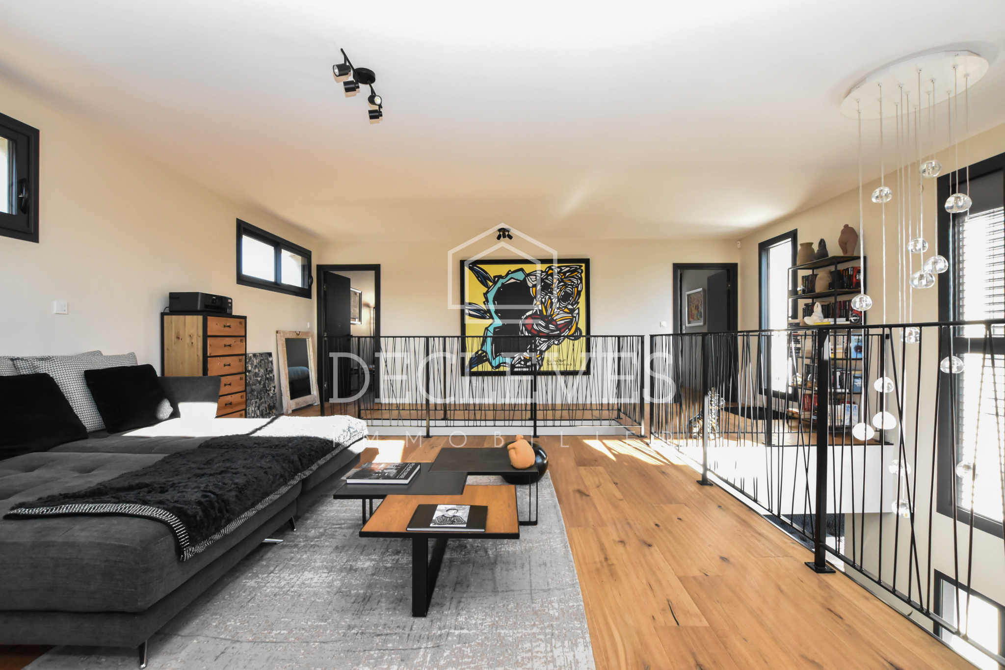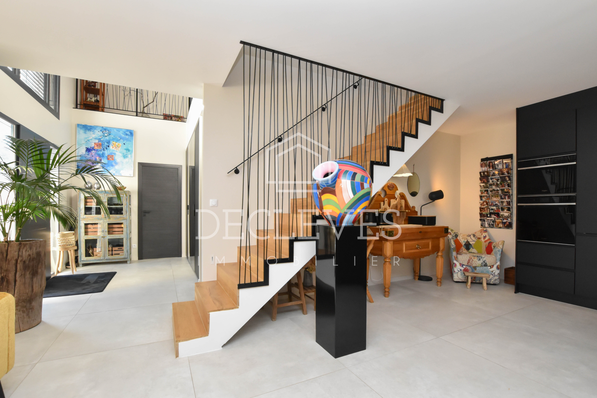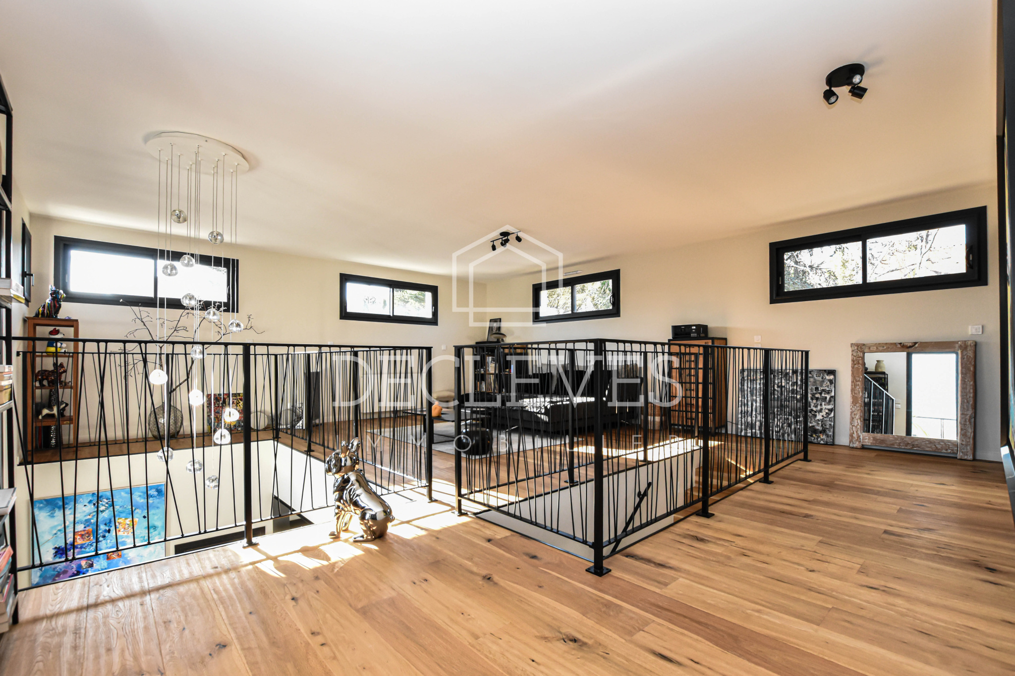 À l’étage, une vaste mezzanine modulable — idéale en chambre supplémentaire, bureau ou salle de sport — dessert deux belles chambres, une salle d’eau avec toilettes ainsi qu’une superbe terrasse de 27 m2 offrant une vue dégagée sur le jardin.