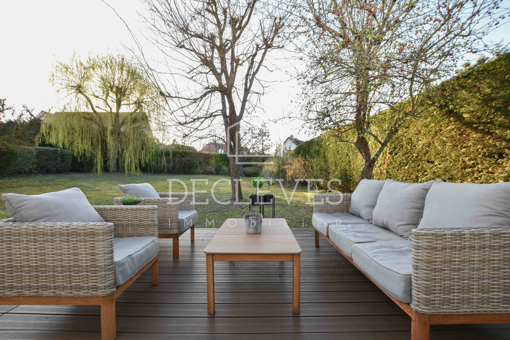 Le jardin, parfaitement entretenu, propose un cadre verdoyant et paisible. Un véritable espace de détente pour profiter des moments en famille ou entre amis.
